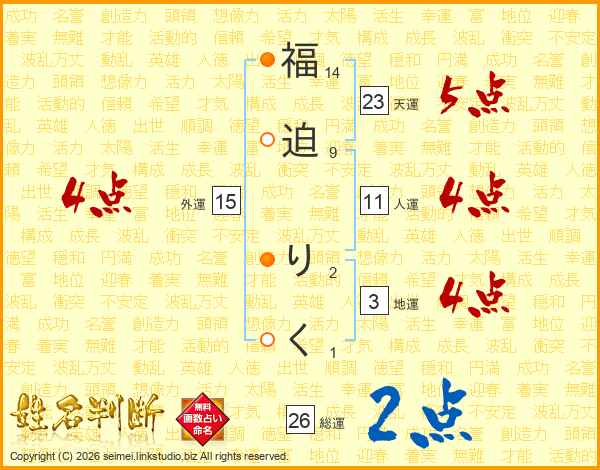 生活面を象徴する運勢です。外部から受ける影響力を表し、結婚運、家庭運や職場、環境への順応性を表します。総運から人運を引いた画数。姓や名が1文字の場合を除く。