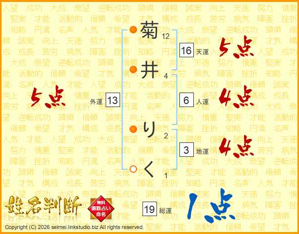 あなたの人生を表す1番重要な運勢です。生涯を通じて影響する総合運となり、主に50歳以降の晩年期に影響を及ぼします。苗字と名前の合計画数。