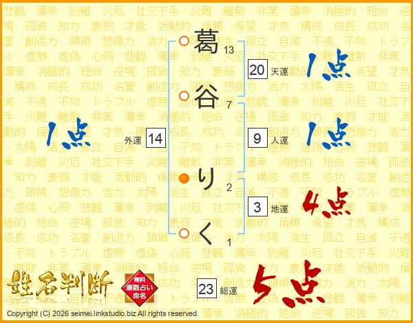 生活面を象徴する運勢です。外部から受ける影響力を表し、結婚運、家庭運や職場、環境への順応性を表します。総運から人運を引いた画数。姓や名が1文字の場合を除く。