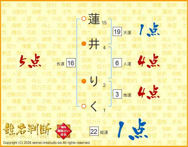 生活面を象徴する運勢です。外部から受ける影響力を表し、結婚運、家庭運や職場、環境への順応性を表します。総運から人運を引いた画数。姓や名が1文字の場合を除く。