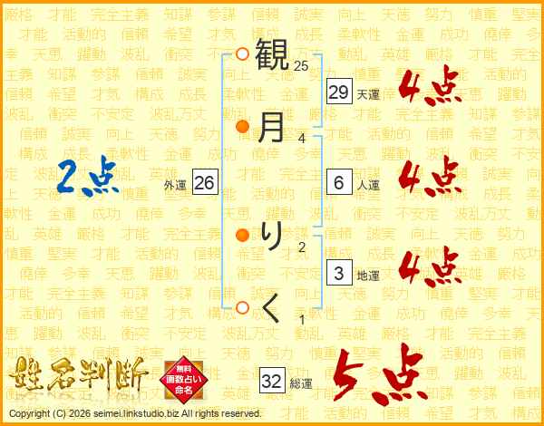 生活面を象徴する運勢です。外部から受ける影響力を表し、結婚運、家庭運や職場、環境への順応性を表します。総運から人運を引いた画数。姓や名が1文字の場合を除く。