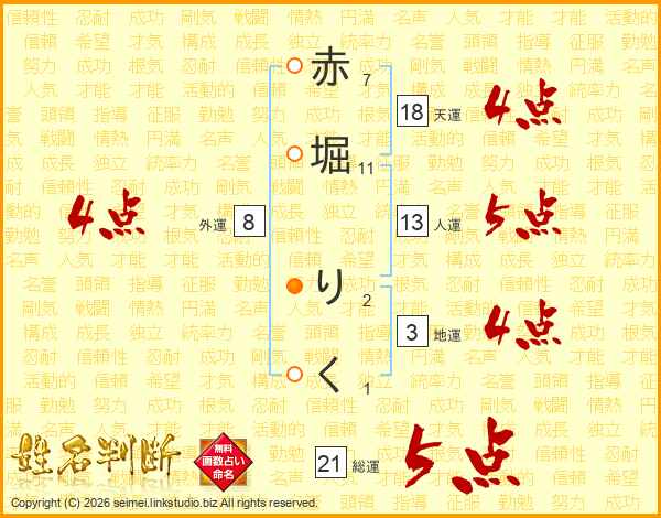 生活面を象徴する運勢です。外部から受ける影響力を表し、結婚運、家庭運や職場、環境への順応性を表します。総運から人運を引いた画数。姓や名が1文字の場合を除く。