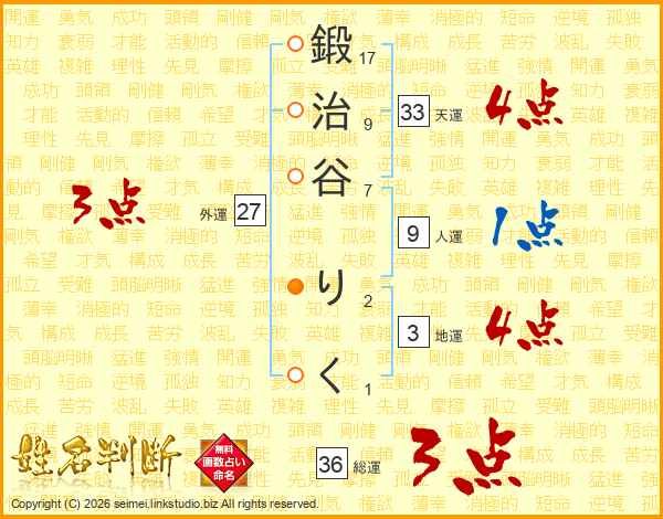 鍛(17画)治(9画)谷(7画) り(2画)く(1画)