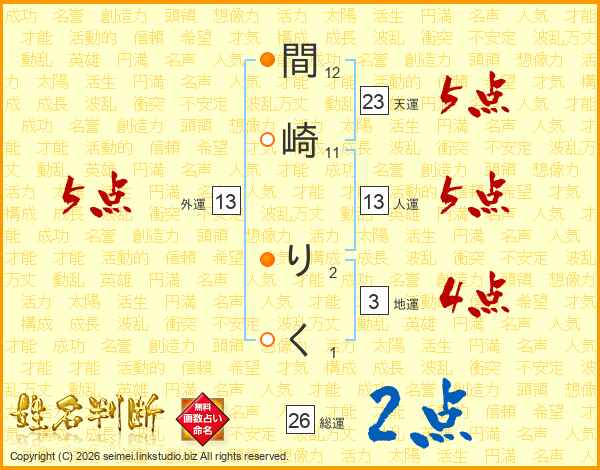 生活面を象徴する運勢です。外部から受ける影響力を表し、結婚運、家庭運や職場、環境への順応性を表します。総運から人運を引いた画数。姓や名が1文字の場合を除く。