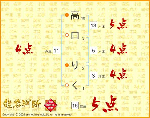 あなたの人生を表す1番重要な運勢です。生涯を通じて影響する総合運となり、主に50歳以降の晩年期に影響を及ぼします。苗字と名前の合計画数。
