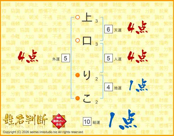 生活面を象徴する運勢です。外部から受ける影響力を表し、結婚運、家庭運や職場、環境への順応性を表します。総運から人運を引いた画数。姓や名が1文字の場合を除く。