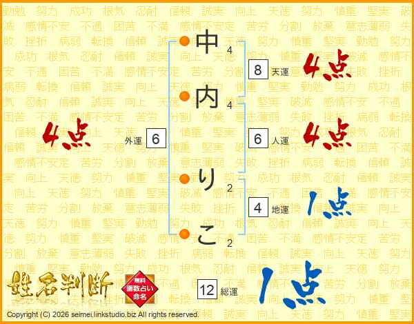 生活面を象徴する運勢です。外部から受ける影響力を表し、結婚運、家庭運や職場、環境への順応性を表します。総運から人運を引いた画数。姓や名が1文字の場合を除く。