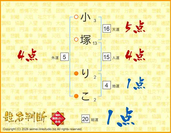 生活面を象徴する運勢です。外部から受ける影響力を表し、結婚運、家庭運や職場、環境への順応性を表します。総運から人運を引いた画数。姓や名が1文字の場合を除く。