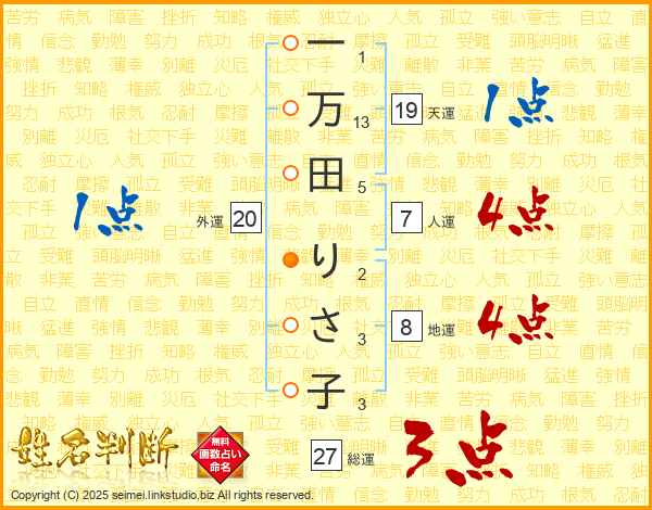 一(1画)万(13画)田(5画) り(2画)さ(3画)子(3画)