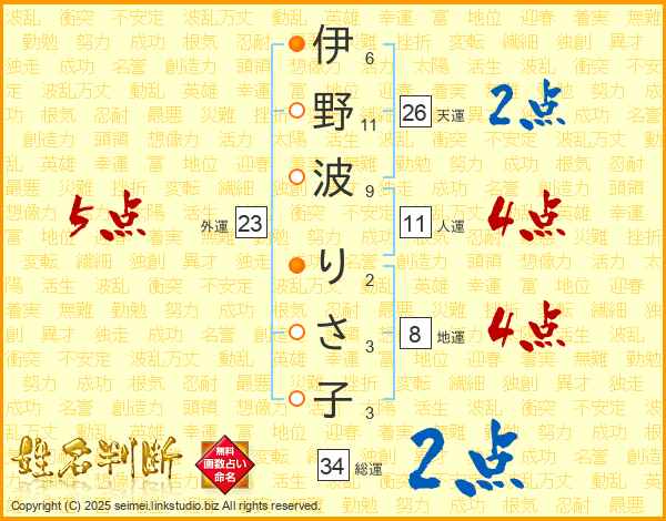 伊(6画)野(11画)波(9画) り(2画)さ(3画)子(3画)
