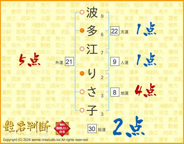 波(9画)多(6画)江(7画) り(2画)さ(3画)子(3画)
