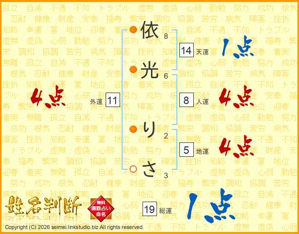 生活面を象徴する運勢です。外部から受ける影響力を表し、結婚運、家庭運や職場、環境への順応性を表します。総運から人運を引いた画数。姓や名が1文字の場合を除く。