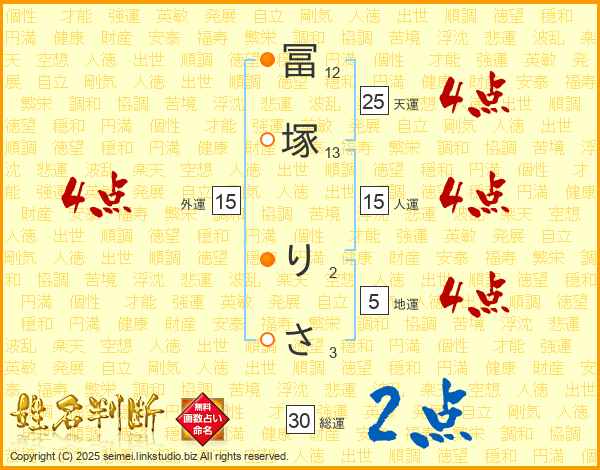 生活面を象徴する運勢です。外部から受ける影響力を表し、結婚運、家庭運や職場、環境への順応性を表します。総運から人運を引いた画数。姓や名が1文字の場合を除く。