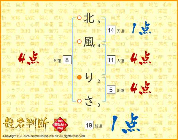生活面を象徴する運勢です。外部から受ける影響力を表し、結婚運、家庭運や職場、環境への順応性を表します。総運から人運を引いた画数。姓や名が1文字の場合を除く。