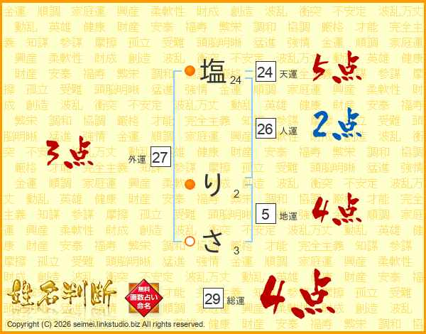 生活面を象徴する運勢です。外部から受ける影響力を表し、結婚運、家庭運や職場、環境への順応性を表します。総運から人運を引いた画数。姓や名が1文字の場合を除く。