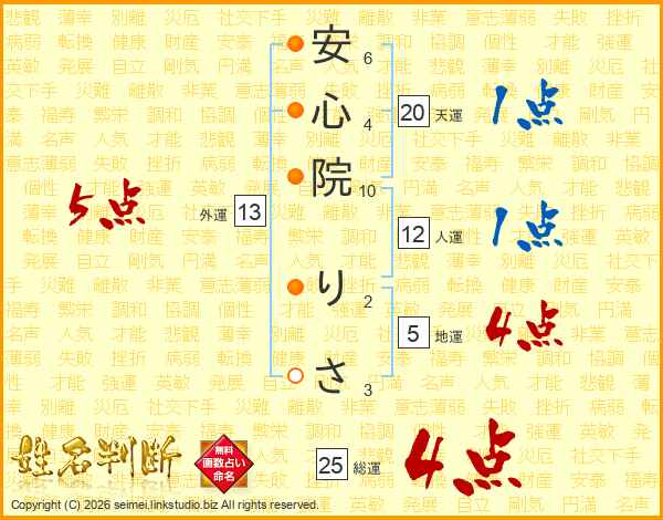 安(6画)心(4画)院(10画) り(2画)さ(3画)