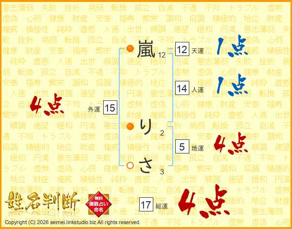 生活面を象徴する運勢です。外部から受ける影響力を表し、結婚運、家庭運や職場、環境への順応性を表します。総運から人運を引いた画数。姓や名が1文字の場合を除く。