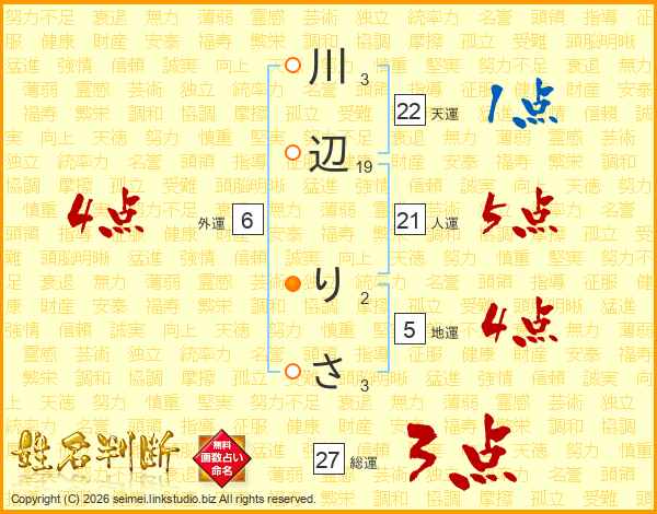 生活面を象徴する運勢です。外部から受ける影響力を表し、結婚運、家庭運や職場、環境への順応性を表します。総運から人運を引いた画数。姓や名が1文字の場合を除く。