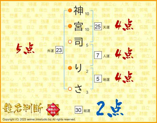 神(10画)宮(10画)司(5画) り(2画)さ(3画)