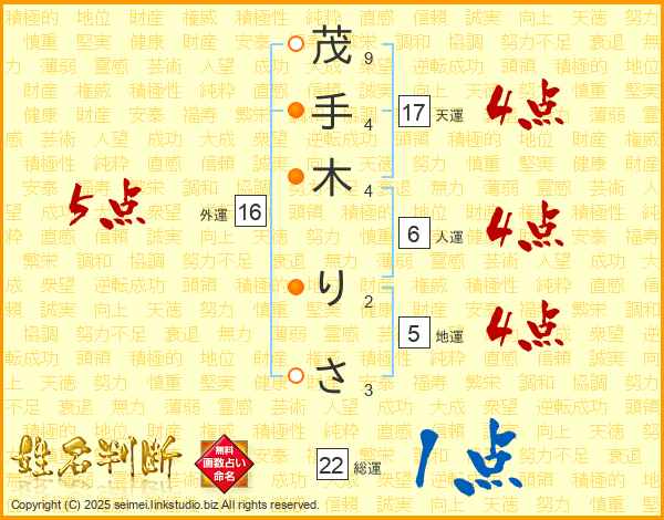 茂(9画)手(4画)木(4画) り(2画)さ(3画)