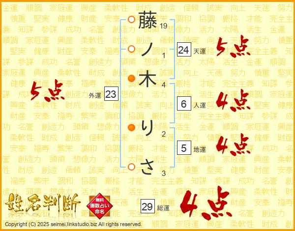 藤(19画)ノ(1画)木(4画) り(2画)さ(3画)