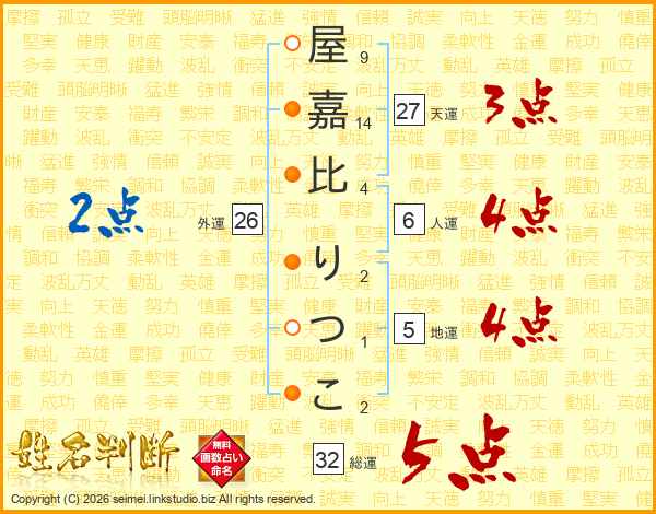 屋(9画)嘉(14画)比(4画) り(2画)つ(1画)こ(2画)