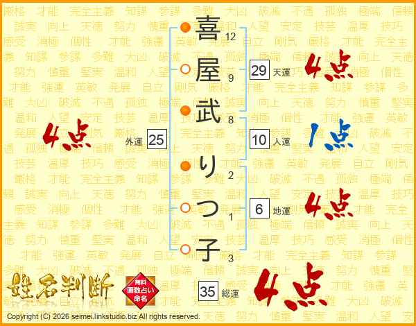 喜(12画)屋(9画)武(8画) り(2画)つ(1画)子(3画)