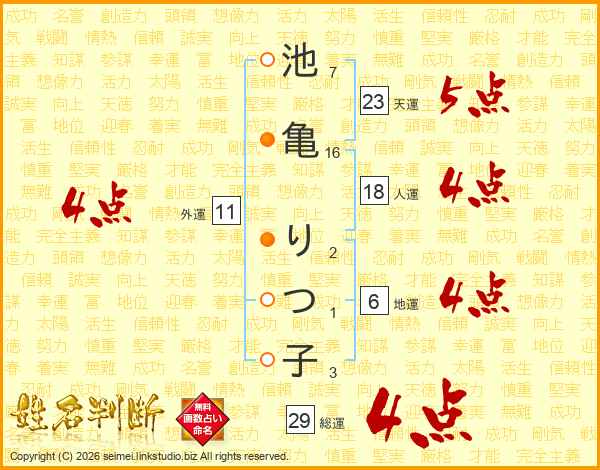 池(7画)亀(16画) り(2画)つ(1画)子(3画)