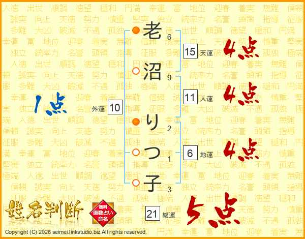 老(6画)沼(9画) り(2画)つ(1画)子(3画)