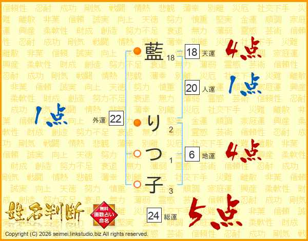 生活面を象徴する運勢です。外部から受ける影響力を表し、結婚運、家庭運や職場、環境への順応性を表します。総運から人運を引いた画数。姓や名が1文字の場合を除く。