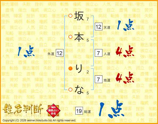 生活面を象徴する運勢です。外部から受ける影響力を表し、結婚運、家庭運や職場、環境への順応性を表します。総運から人運を引いた画数。姓や名が1文字の場合を除く。