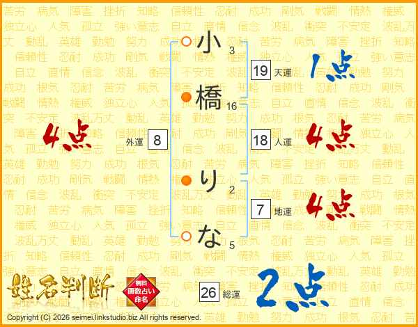 小橋りなさんの総運は26画の2点!