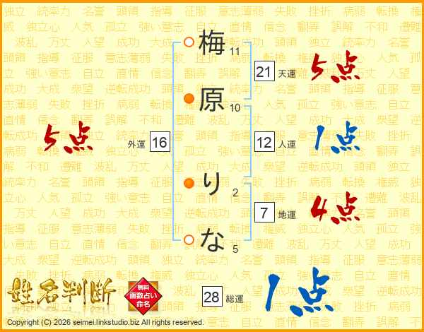 梅原りなさんの天運は21画の5点!
