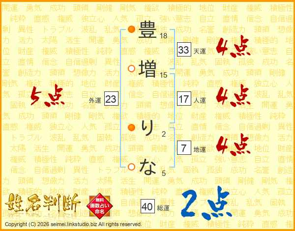 生活面を象徴する運勢です。外部から受ける影響力を表し、結婚運、家庭運や職場、環境への順応性を表します。総運から人運を引いた画数。姓や名が1文字の場合を除く。