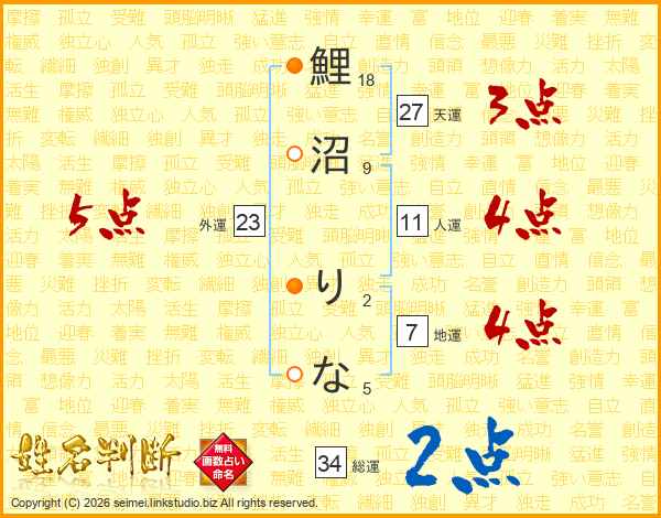 あなたの人生を表す1番重要な運勢です。生涯を通じて影響する総合運となり、主に50歳以降の晩年期に影響を及ぼします。苗字と名前の合計画数。