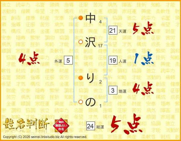 中沢りのさんの総運は24画の5点!