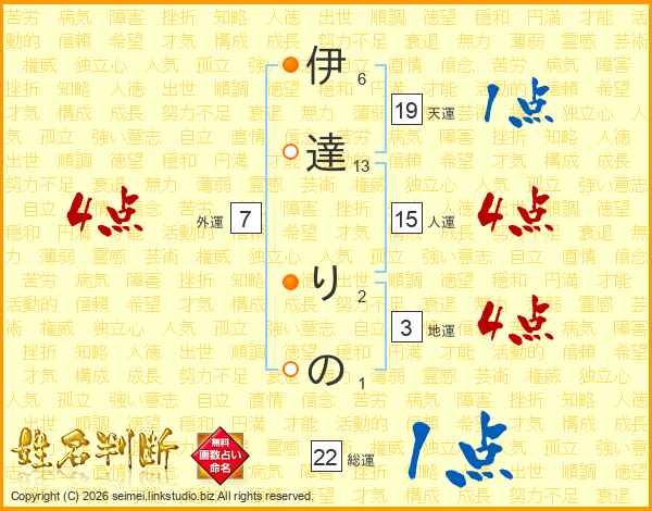 あなたの人生を表す1番重要な運勢です。生涯を通じて影響する総合運となり、主に50歳以降の晩年期に影響を及ぼします。苗字と名前の合計画数。