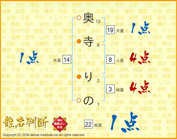 生活面を象徴する運勢です。外部から受ける影響力を表し、結婚運、家庭運や職場、環境への順応性を表します。総運から人運を引いた画数。姓や名が1文字の場合を除く。