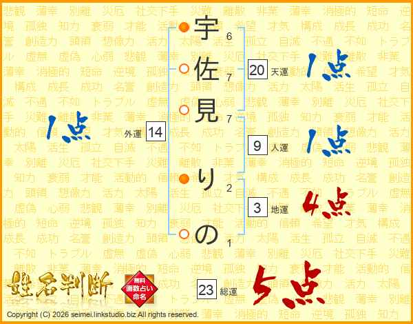 宇(6画)佐(7画)見(7画) り(2画)の(1画)