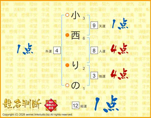 生活面を象徴する運勢です。外部から受ける影響力を表し、結婚運、家庭運や職場、環境への順応性を表します。総運から人運を引いた画数。姓や名が1文字の場合を除く。