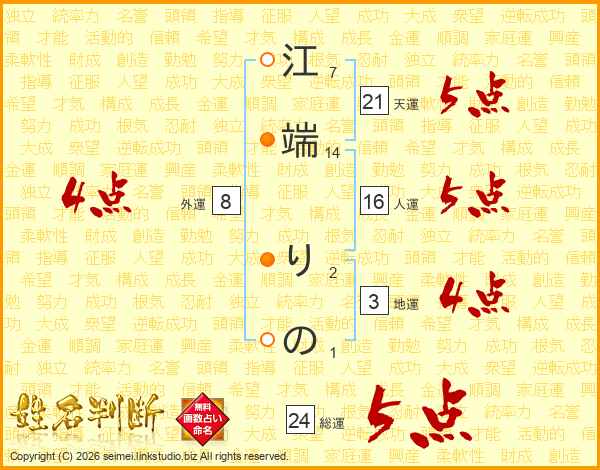 生活面を象徴する運勢です。外部から受ける影響力を表し、結婚運、家庭運や職場、環境への順応性を表します。総運から人運を引いた画数。姓や名が1文字の場合を除く。