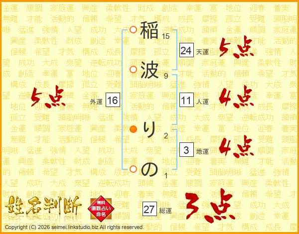 生活面を象徴する運勢です。外部から受ける影響力を表し、結婚運、家庭運や職場、環境への順応性を表します。総運から人運を引いた画数。姓や名が1文字の場合を除く。