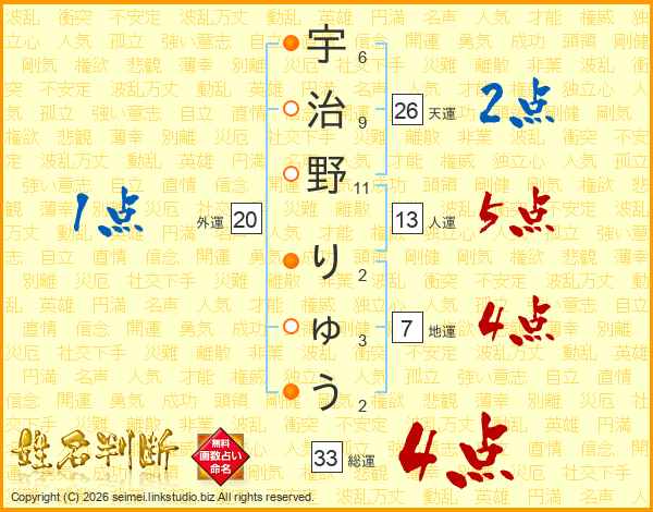 宇(6画)治(9画)野(11画) り(2画)ゅ(3画)う(2画)