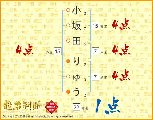小(3画)坂(7画)田(5画) り(2画)ゅ(3画)う(2画)