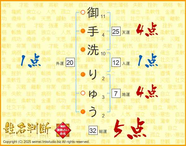 生活面を象徴する運勢です。外部から受ける影響力を表し、結婚運、家庭運や職場、環境への順応性を表します。総運から人運を引いた画数。姓や名が1文字の場合を除く。