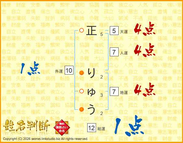 生活面を象徴する運勢です。外部から受ける影響力を表し、結婚運、家庭運や職場、環境への順応性を表します。総運から人運を引いた画数。姓や名が1文字の場合を除く。