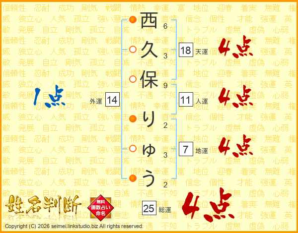 西(6画)久(3画)保(9画) り(2画)ゅ(3画)う(2画)