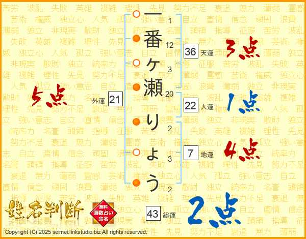 一番ヶ瀬りょうさんの総運は43画の2点!