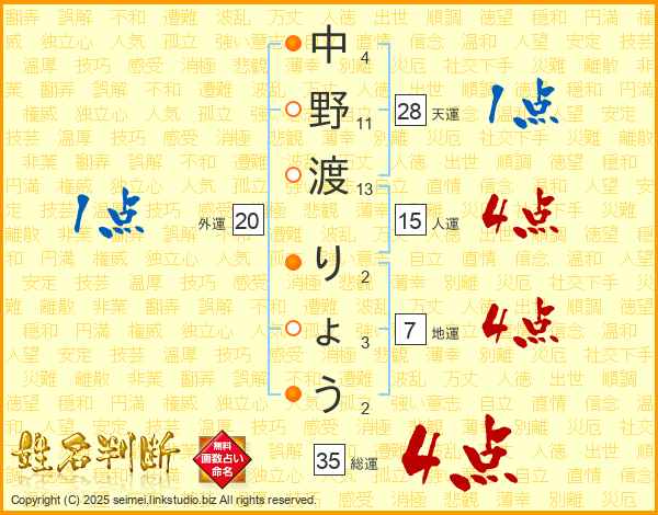 生活面を象徴する運勢です。外部から受ける影響力を表し、結婚運、家庭運や職場、環境への順応性を表します。総運から人運を引いた画数。姓や名が1文字の場合を除く。