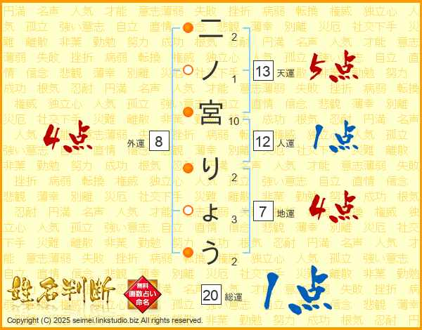 生活面を象徴する運勢です。外部から受ける影響力を表し、結婚運、家庭運や職場、環境への順応性を表します。総運から人運を引いた画数。姓や名が1文字の場合を除く。
